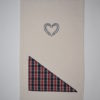 Le col de la serviette est bordé d’un imprimé nuancé de gris.